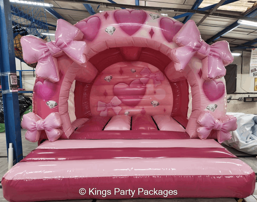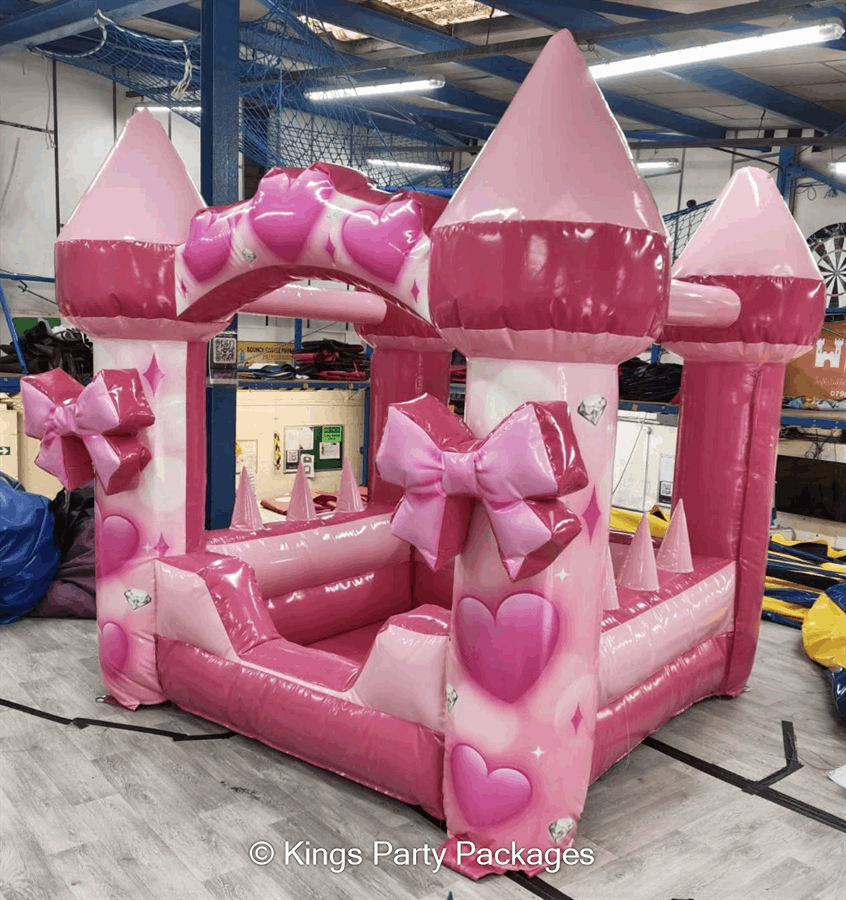 One of the biggest reasons parents love this package is because it includes two matching inflatables. One pink princess bouncy castle is covered in pretty heart, bow and diamond artwork, with castle turrets and bright pink colours that make it a real centrepiece for the party.